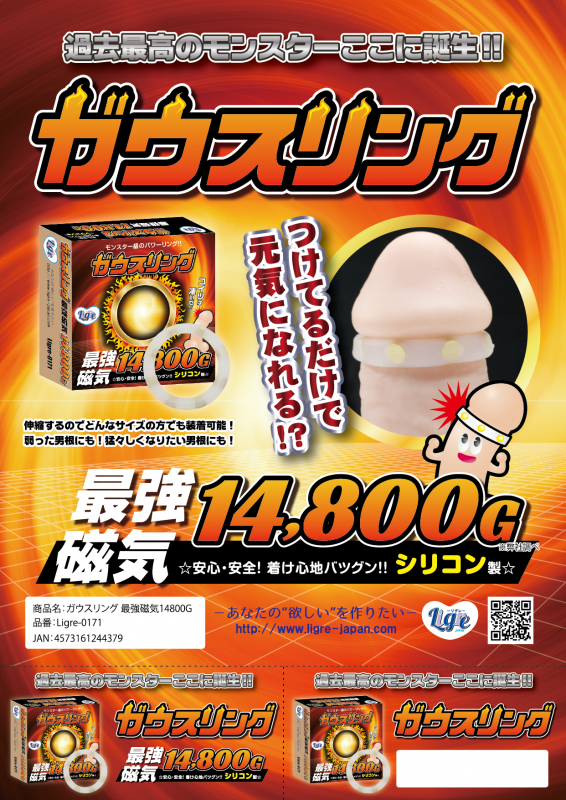 Best Gauss ever! Super Gauss! What a surprise! The name "Gauss Ring 14800G" is now on sale! Power up your weak phallus with magnetic force! Power up just by wearing it! And everyone who wants to become even more fierce! Power up!
