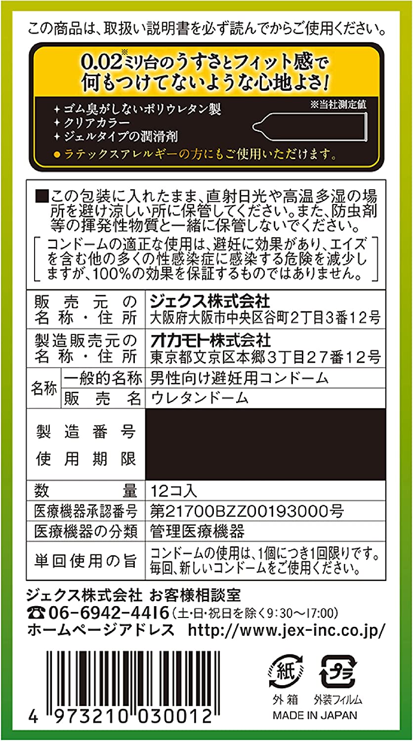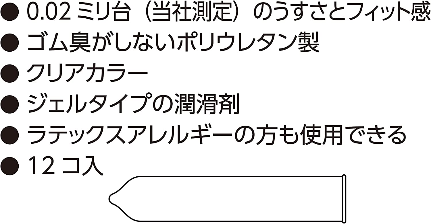 A condom with a thinness and fit in the 0.02mm range (measured by JEX). Made of soft polyurethane that does not smear. Gel-type lubricant. Can be used by people with latex allergies.