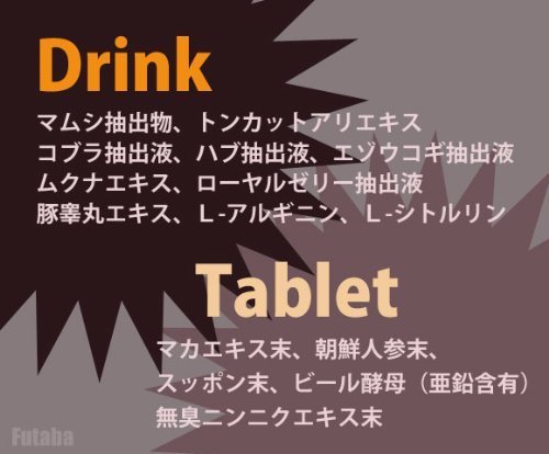 Snake Drink is made up of three kinds of snakes, mainly the most energetic pit viper, cobra, and habu, and contains "pork testicle extract" and the popular "royal jelly" for increasing energy, "tongkat ali", "mucuna", and "ezo-ukogi" that are currently attracting attention as plant materials, and "suppon", the source of energy, in the pill form. The tablets contain "Suppon", the source of energy, "Maca", the most famous material, "Ginseng", "Zinc" and "Garlic", which are essential for energy, and by taking them together, a total of 12 kinds of plant and animal materials are ingested!