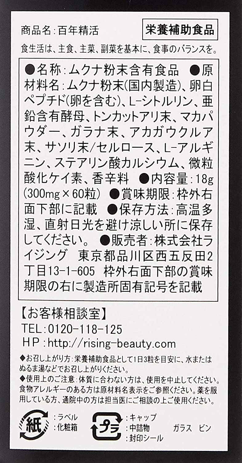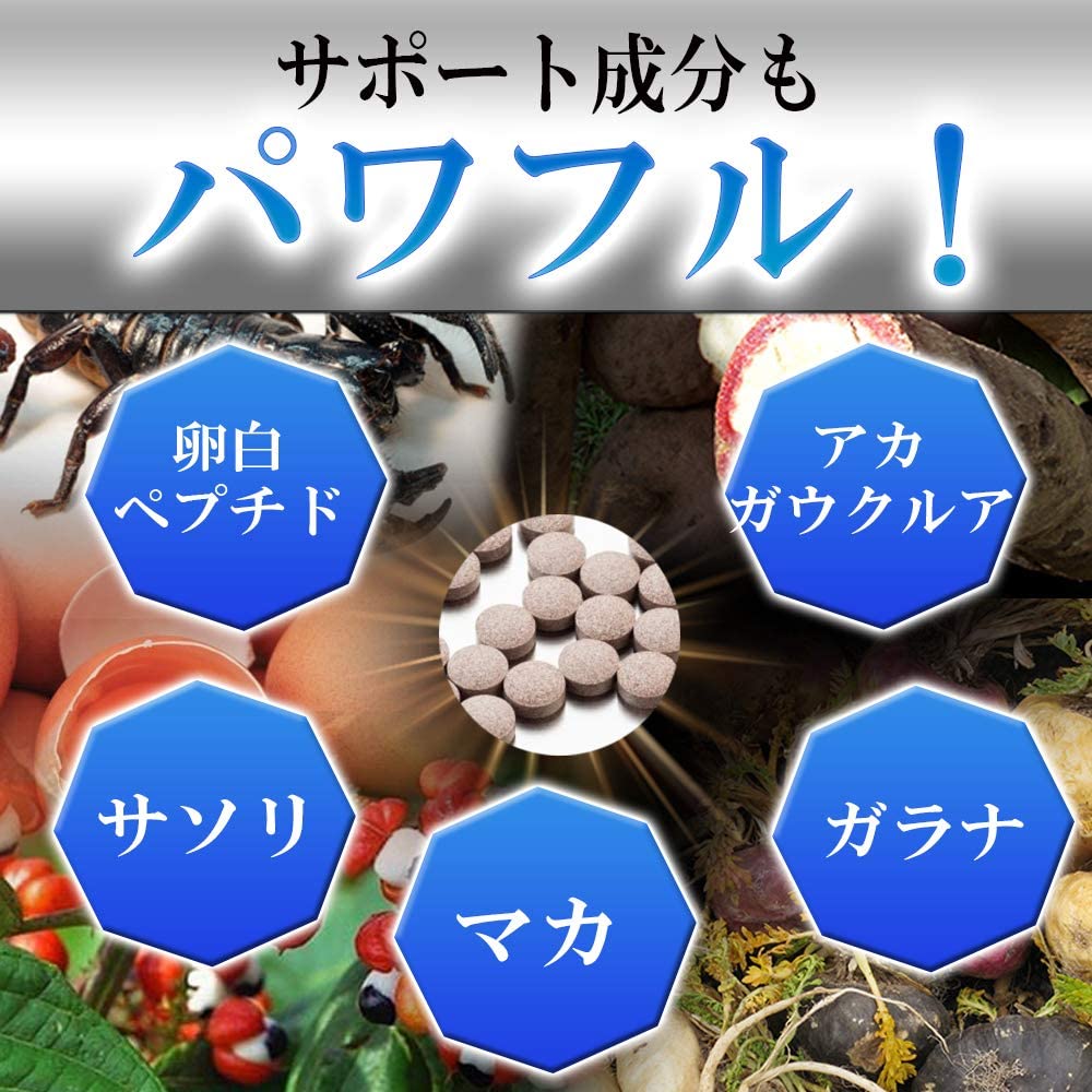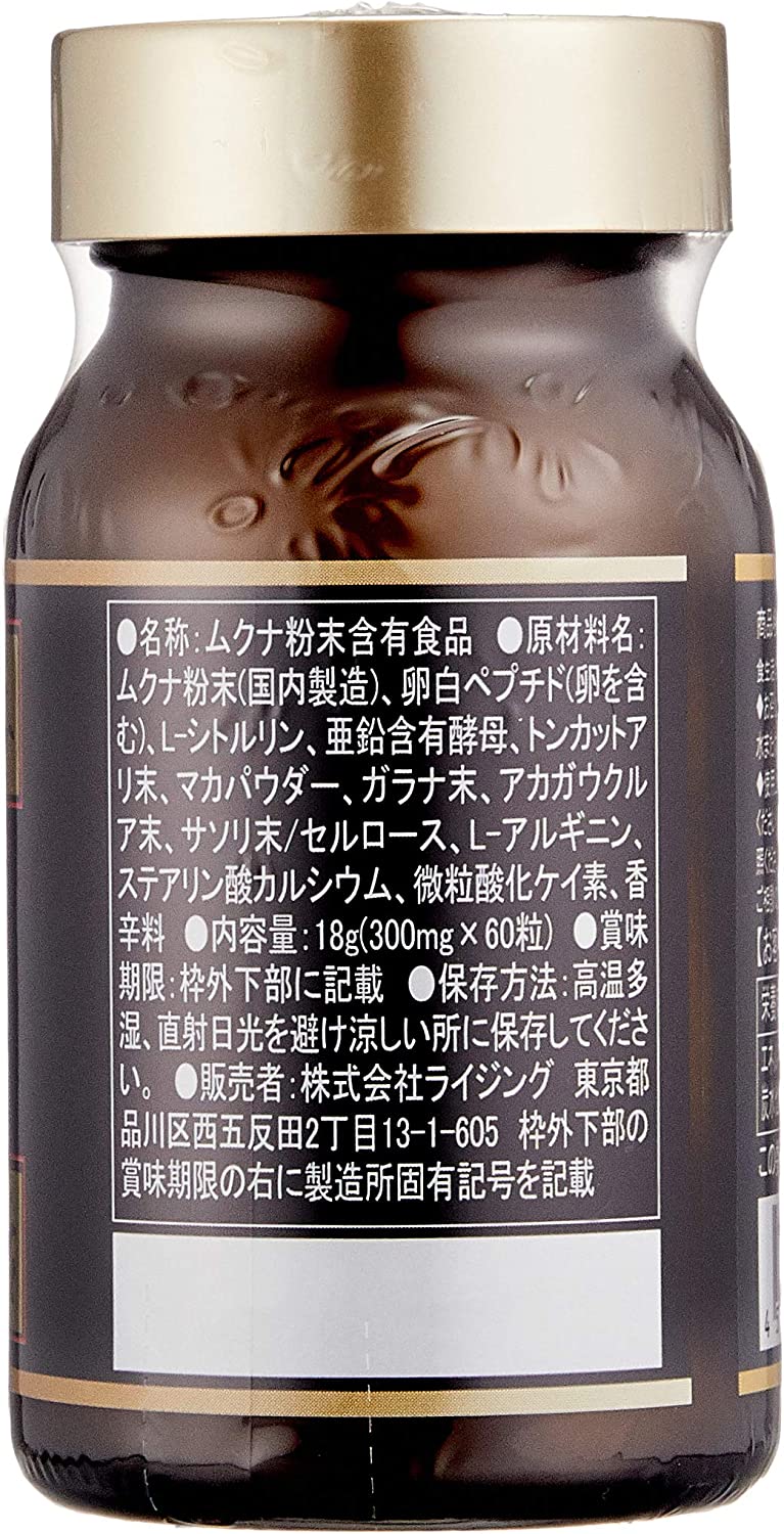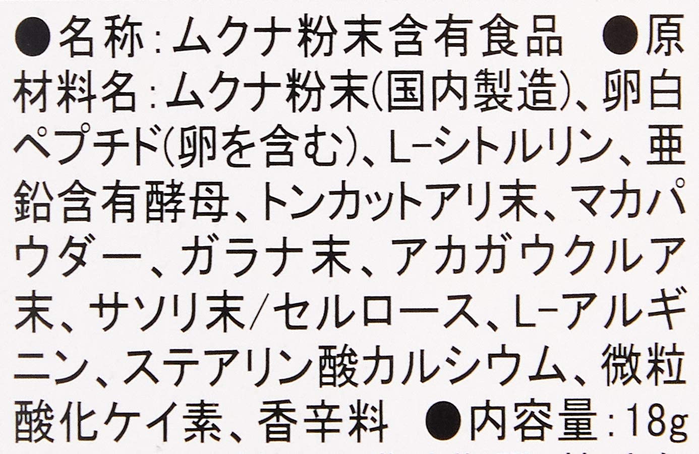 - Mucuna powder (manufactured in Japan), egg white peptide (contains egg), L-citrulline, zinc-containing yeast, Tongkat Ali powder, maca powder, guarana powder, acagauclua powder, scorpion powder/cellulose, L-arginine, calcium stearate, silicon dioxide micro granules, spices