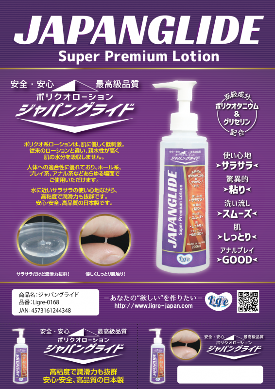 Ultra-premium ingredients! Polyquaternium & glycerin based, a completely new lotion! It can be used for hole, play, and anal applications! It has a silky, almost water-like consistency, but it also has a strong lubricating power, making it a perfect match for all types of play! Made in Japan for safety and security!