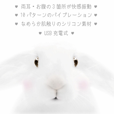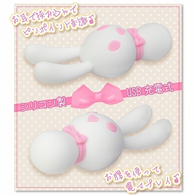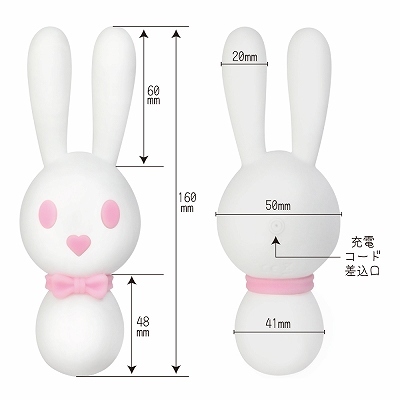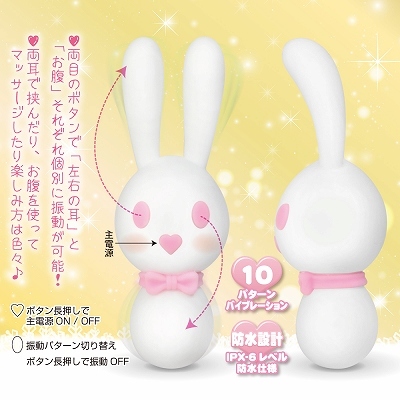 Vibration function / USB rechargeable (cord included)]##Cute white rabbit shaped handheld massager ##Powerful vibrations with a cute face! #Pinpoint stimulation by clamping it between both ears, or you can use the belly part to play with a condom. ##Cute cheeks glow while vibrating and charging###There are 3 powerful motors on the tips of both ears and on the belly##10 vibration patterns###Smooth silicone material###Waterproof (IPX-6 level).