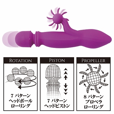 Piston & Propeller Rotation / USB Rechargeable] #Propeller rotates wildly and caresses clitoris with gusto! #Powerful piston head develops the porthio! #Built-in ball rotates to stimulate the G-spot! #The built-in ball rotates to stimulate the G-spot! ##Flexible neck propeller fits to the clitoris and delivers a firm and pleasurable stimulation. ##7-pattern head piston ##7-pattern ball rotation with built-in head ##8-pattern propeller rolling ##Silicon material ##USB rechargeable (cord included) ##Waterproof ##Recharge time: 90