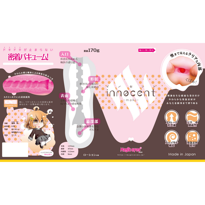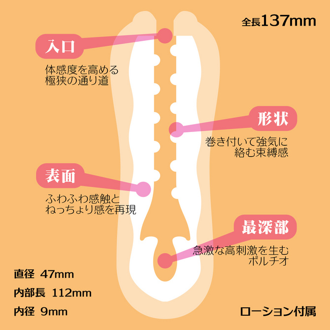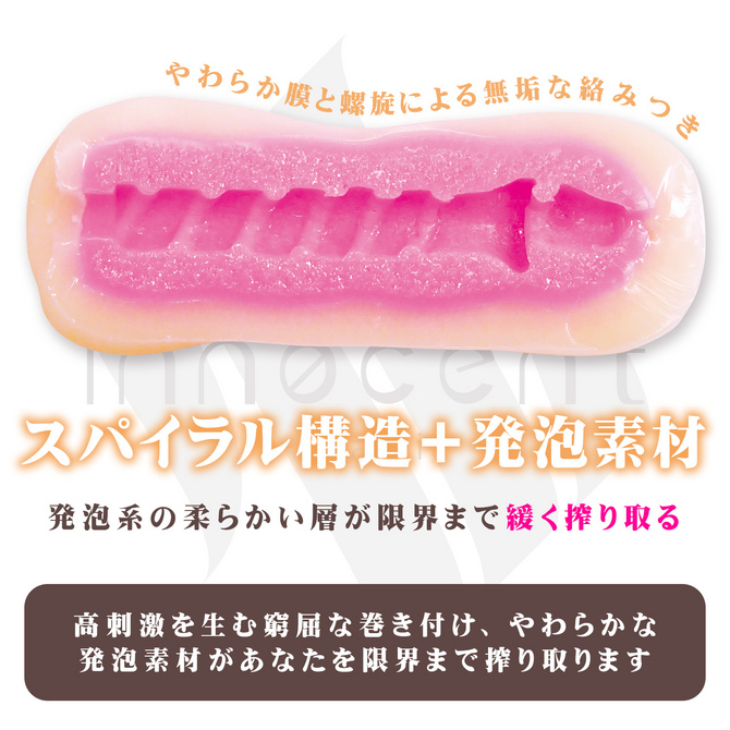 Please note that the inner layer may come off when you turn it over for cleaning because it is completely double molded separately. Newly adopted squeeze-fit material produced by the no-shaft-displacement manufacturing method. The inner layer is foam processed to gently envelop you in a spiral impulse! With an internal length of 11.2 cm, it is designed to penetrate the depths of your body and silence the docile Maki!