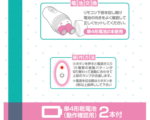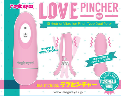 Pinch and blubber, here comes the Love Pincher! Unlike conventional nipple rotors, the clip part weighs only 8 grams and is equipped with an ultra-compact motor, making it lightweight and powerful, so it can be used not only on nipples but also on sensitive areas! The remote control unit has LED lights that are linked to the vibration patterns, so you can check the vibration patterns even in dark places. It is waterproof and can be washed after use to keep it clean. The color is a lovely pink with a matte finish, giving it a luxurious feel, and the soundproof design allows you to use it alone or in secret.... It is also recommended for those who are tired of just using a regular rotor and find it insufficient for their needs. This clip-on double rotor from Magiceyes is sure to be a favorite for a long time to come! Uses 2 AAA batteries