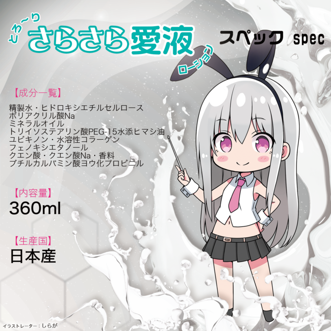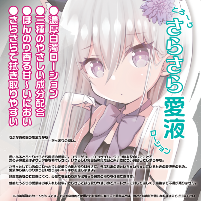 Because it is made from the love juice of an ubiquitous girl, it has plenty of moisture and moisturizing power. The rich and moist love juice has a smooth texture, and the combination of collagen, coenzyme Q10, and citric acid gives the girl's love juice a more realistic and primitive appearance. The milky-white appearance and stringiness of the love juices may excite you. The smooth yet sticky feel and slippery texture is just like the love juice you get when you are making out with a bawdy girl. The sweet aroma wafting from the love juice will accelerate your heart pounding. The high viscosity of the liquid keeps it from drying out, and even a small amount will give you a great sliding experience that will make you squeal. The love juice is easy to clean up. It is smooth and easy to wipe off, so it is gentle to your partner and leaves no complaints until the end.