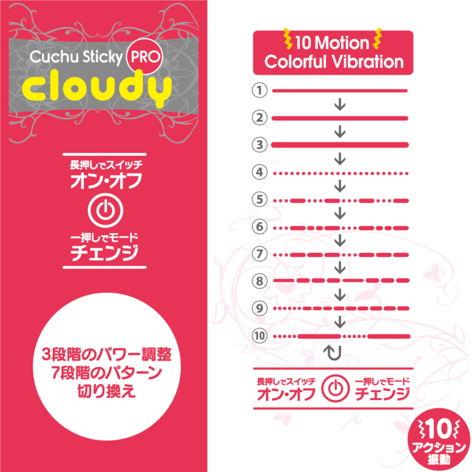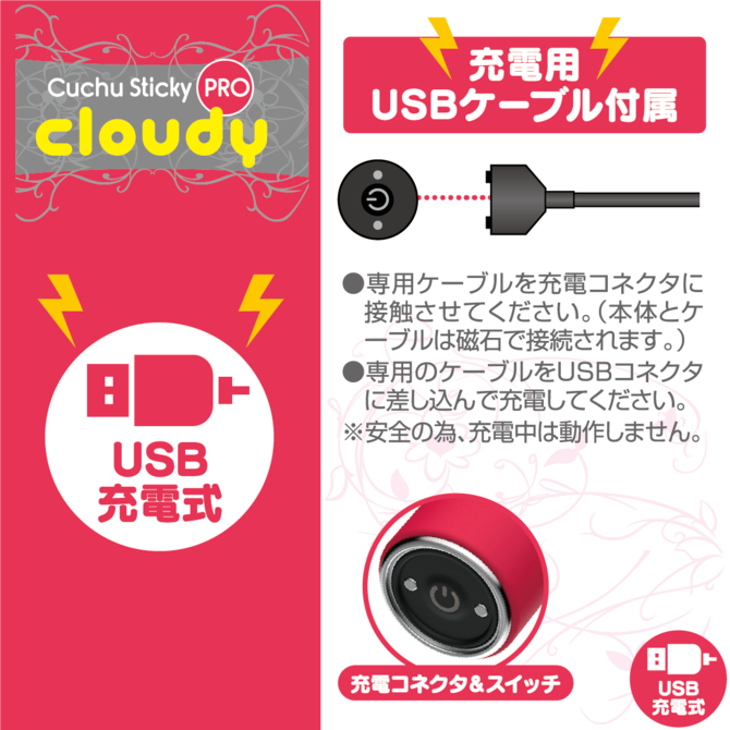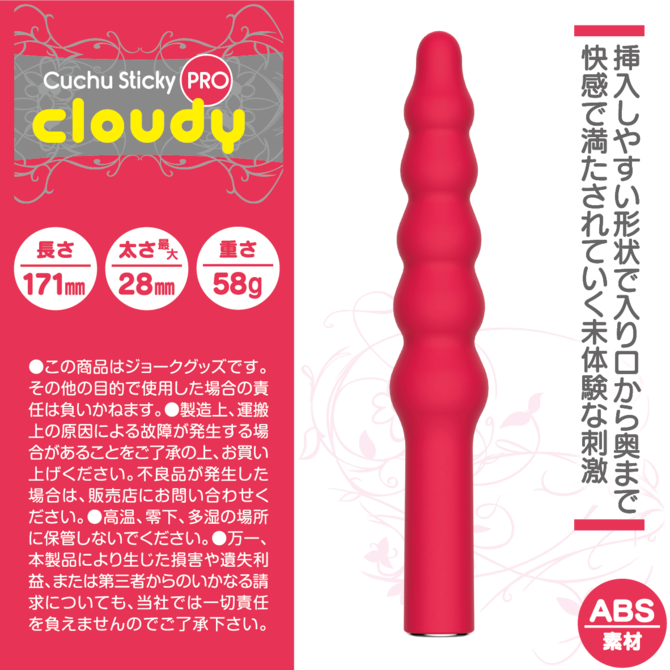 The cloud-like shape allows you to enjoy stimulation from the entrance to the depths, and with 10 vibration modes, you are sure to find the stimulation you like. The waterproof design makes maintenance easy. A magnetic USB cable is included for charging, so you can charge the battery at home. Operation is also easy, as it can be turned on and off by pressing and holding the power switch. The crimson matte coated body is 171mm long and large enough to be used by anyone, with a maximum thickness of 28mm, starting from the thinnest part and gradually becoming thicker. Weighing only 58g, it is lightweight and can be used for long periods of time.