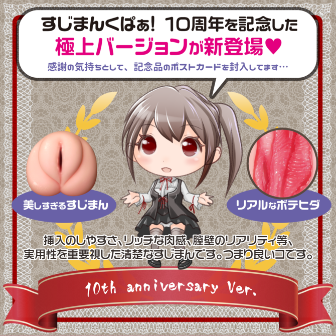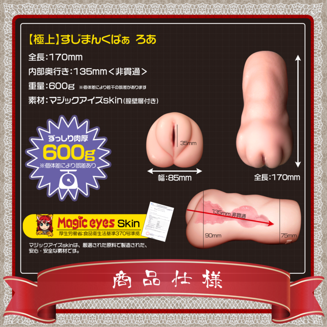 The 35mm body was designed with an ideal length of 35mm to commemorate the 10th anniversary of "Sujimanku Paaroa". The seven realistic folds represent a slightly matured Roha while maintaining the best parts of the character. The vaginal wall with oversized folds is made possible by the 600g thick body, which is large for a handhole. A secret postcard, lubricant, and a clear case for storage are also included for your enjoyment.