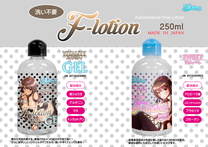 Three large potehidas intertwine with each other, and countless warts and fine folds squeeze the deeper you go. The included F Lotion SWEET not only has a generous 250ml capacity, but also contains aloe vera, coenzyme, placenta, and collagen, making it a highly concentrated moisturizing and lubricating lotion. It works great with holes! Made entirely in Japan, Pote Hida SWEET can be used by beginners and advanced users alike.