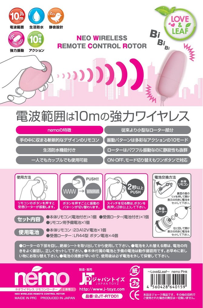 Let's have fun with powerful wireless! The Neo Wireless Remote Controller "NEMO" is here! The remote control part has a novel shape inspired by a leaf, which is easy to hold in your hand. The smaller rotor part expands the range of play. The nemo is equipped with a variety of vibration patterns with 10 actions. Powerful vibration with excellent quietness. Experience a new world with the high-powered NEMO, which can reach your partner up to 10 meters away. Lovely pink color. Includes replacement batteries for the rotor and remote control.