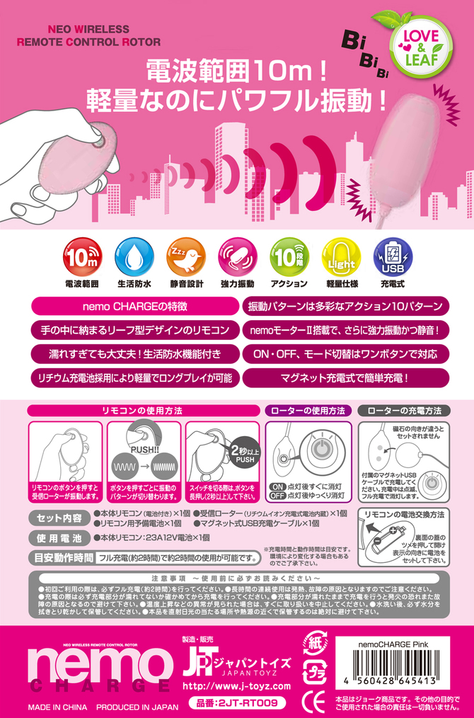 Enjoy the powerful wireless system! From the neo-wireless remote controller "nemo" comes nemoCHARGE, which supports magnetic USB charging. It can now play for about 2 hours on a full charge. The newly equipped nemo2 motor is quieter, has more vibration power, and is lighter than the first generation nemo. Experience a new world with the high-powered NEMO that can reach your partner up to 10 meters away. Lovely pink color. Includes batteries to check the operation of the remote control. ≪(1) The batteries included with the main unit and spare batteries are for checking the operation. Please replace them with new ones as soon as possible. (2) The rotor consumes battery power to receive radio waves even when it is not vibrating. Please be sure to turn off the power and keep it after use.