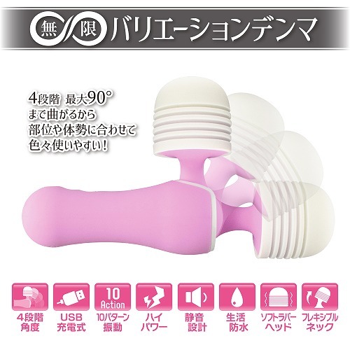 The neck part can be bent in 4 different ways! The ultimate transforming denma has appeared. Easy to use when used alone, from behind, from the side, or at any angle that is comfortable for you to apply! The head has a silky matte finish that is comfortable to the touch, and a flexible neck that gently rebounds. Of course, it is waterproof and has a quiet design! Lithium-ion battery with high-power vibrations! Fully charged in 90 minutes for up to 80 minutes of use (may increase or decrease significantly depending on operating environment and method of use). 10 effective vibration patterns can be programmed. The button light changes colorfully as the pattern changes. Variation densha that bends up to 90 degrees!