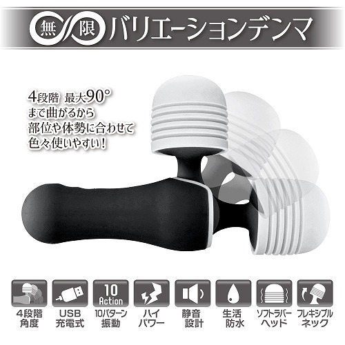 Neck part bends in 4 different positions! The ultimate transforming denma is now available. It is very easy to use because you can adjust the angle to suit your needs, whether you are using it alone, from behind, or from the side! The head has a silky matte finish that is comfortable to the touch, and a flexible neck that gently rebounds. Of course, it is waterproof for daily use and has a quiet design. Lithium-ion battery with high-power vibrations! Fully charged in 90 minutes for up to 80 minutes of use (may increase or decrease significantly depending on operating environment and method of use). 10 effective vibration patterns can be programmed. The button light changes colorfully as the pattern changes. Variation derma that bends up to 90 degrees!