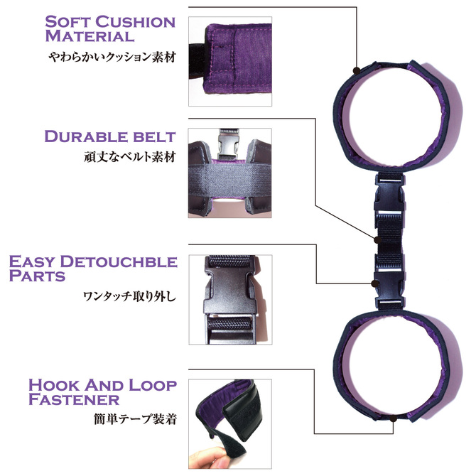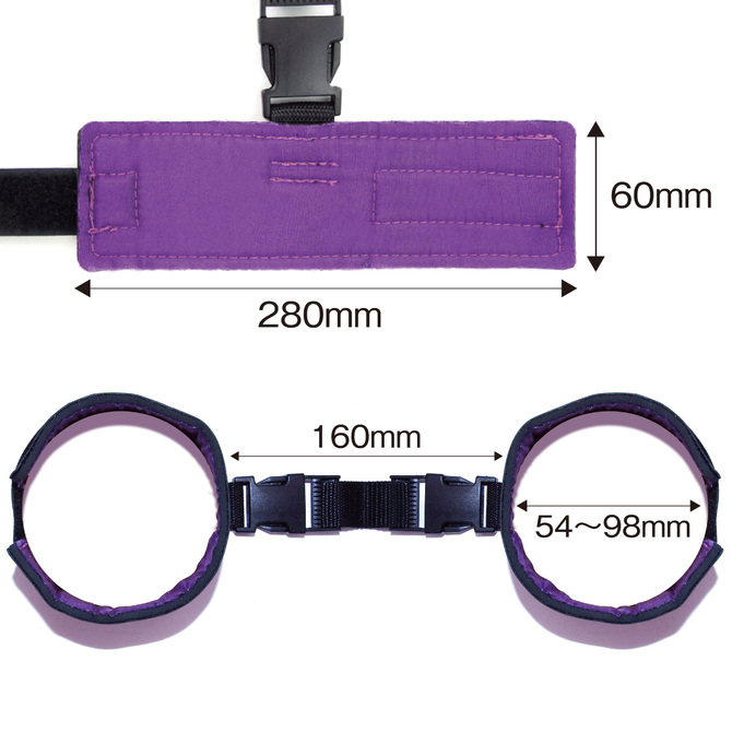 Shackles are standard restraints that bind both ankles. The Velcro allows the size to be adjusted freely and the restraints are easy to use. They are a perfect fit for any physique. Customization by combining parts is also possible.