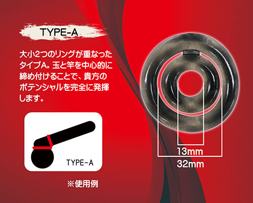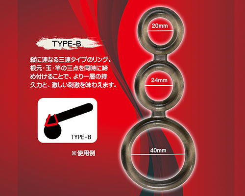 Two types of rings, a 2-ring set and a 3-ring set, can be selected according to your needs! TYPE-A (2 rings) with two overlapping rings (large and small)! By centrally clamping the ball and rod, you can fully demonstrate your potential! TYPE-B (3 rings), with 3 rings in a row, tightens not only the balls and rod, but also the base of the ring to give you more endurance and intense stimulation. The material is made of highly elastic TPE, so it fits just right for any size person. This product can be enjoyed by beginners and intermediate users alike.