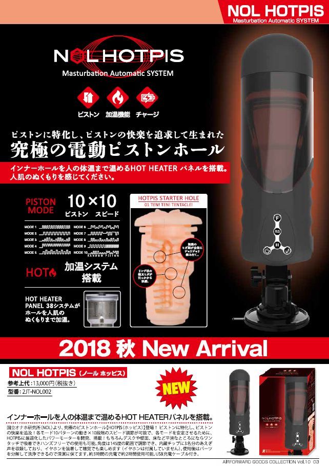 From the National Onaho Laboratory (NOL) comes the ultimate piston hole [HOTPIS]! This time, it specializes in piston and pursues the pleasure of piston! The power motor optimized for HOTPIS has been developed and installed to stabilize each mode! Furthermore, the inner hole is now equipped with a HOT HEATER panel that warms the inner hole to human body temperature. You can feel the warmth of human skin as you play. Of course, the HOT HEATER panel can be adsorbed on smooth surfaces such as desks, walls, and floors with a single touch, allowing for hands-free use. The angle can be adjusted within a range of 145 degrees, and the built-in chip contains three moaning voices, which can also be heard by wearing earphones (earphones not included). After use, the parts can be disassembled and washed to keep it clean. Can be used for approximately 2 hours on a 3-hour charge, and comes with a USB charging cable.