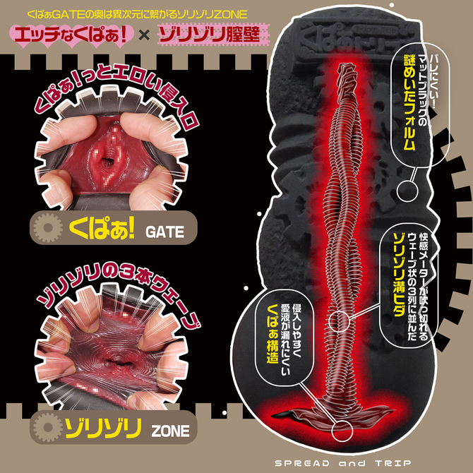 The "Kupaa Trip" is a practicality-specific product equipped with a "Zorisori Zone" on the vaginal wall that blows out the pleasure meter and a "Kupaa GATE" entry port that prevents leakage of love juices! The material used is safe and secure MagicyesSkin (Ministry of Health, Labor and Welfare: Food Sanitation Standard No. 370 compliant material), and the three wavy Zorizoli vaginal folds are coated with an internal layer of crimson vaginal flesh! The appearance produced in matte black sets it apart from other products! It is 340g in practicality size and comes with a clear case for storage. You may have a body that can no longer be satisfied with an ordinary girl!